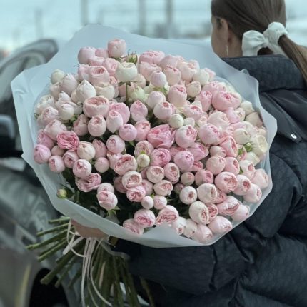 7 кустовых пионовидных роз сильва пинк с эвкалиптом. Букет 25 KimFlo