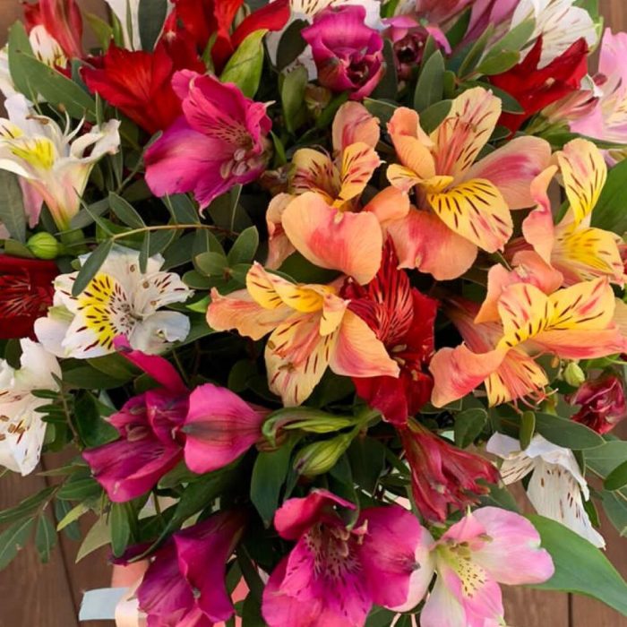 альстромерия микс – 11 шт.Фисташка – 10 шт.Шляпная коробка с лентами – 1 шт.Оазис флористический – 1 шт.