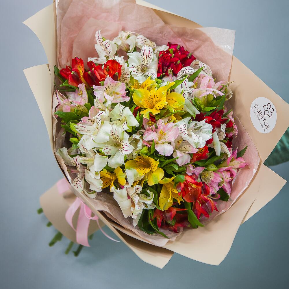 Альстромерия белая – 5 шт.Альстромерия розовая – 5 шт.Альстромерия красная – 5 шт.Упаковка крафт – 1 шт.Атласная лента – 1 шт.
