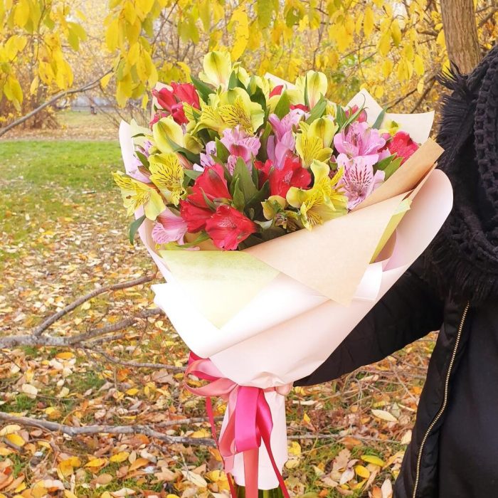 Лента атласная – 2 шт.Упаковка дизайнерская – 3 шт.Открыточка с вашими пожеланиями – 1 шт.Альстромерия Микс Европа – 9 шт.любовь флориста (бесплатно) – 1 шт.