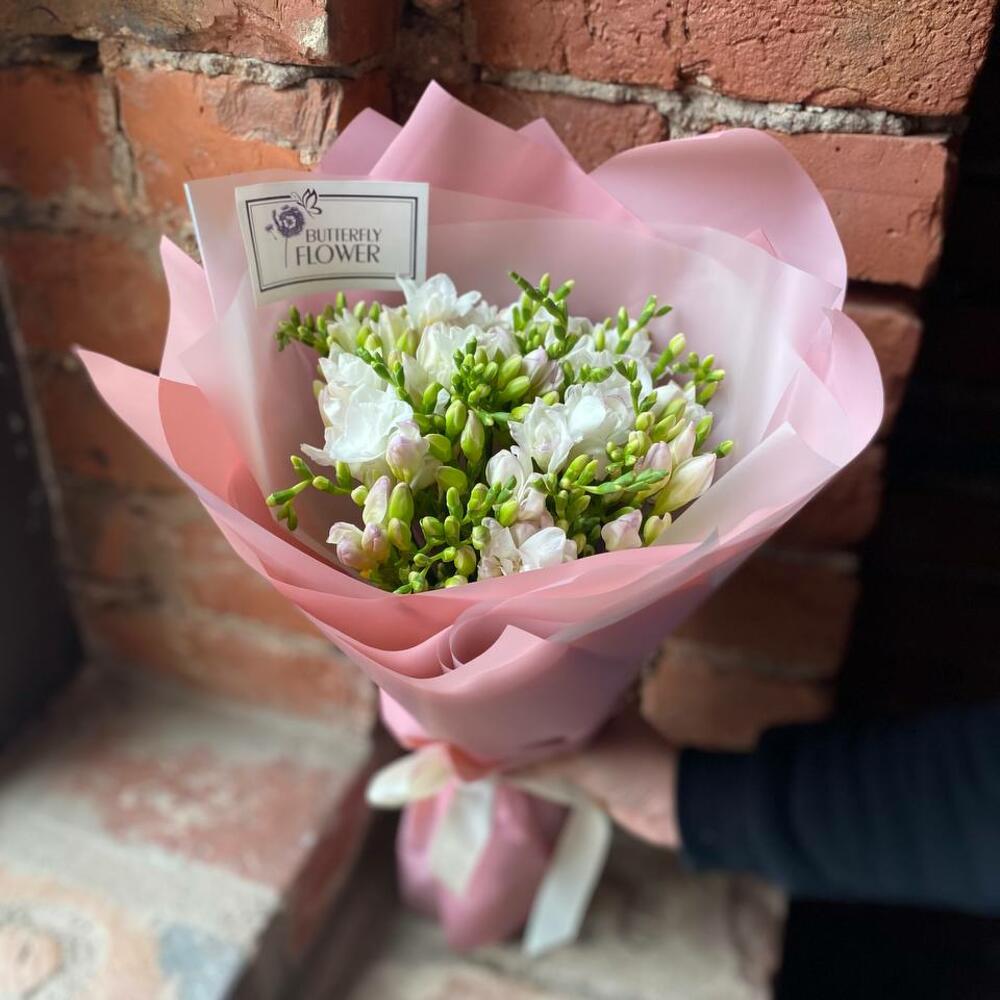 Букет из 23 белых фрезий в стильной упаковке “Мегги Вэлли”