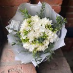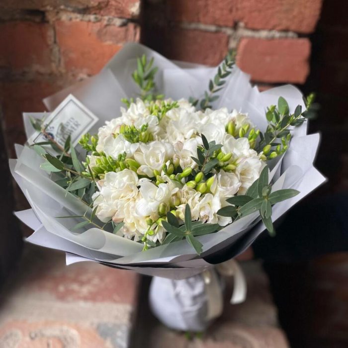 Букет из 25 белых фрезий и эвкалипта в стильной упаковке “Мерриам”