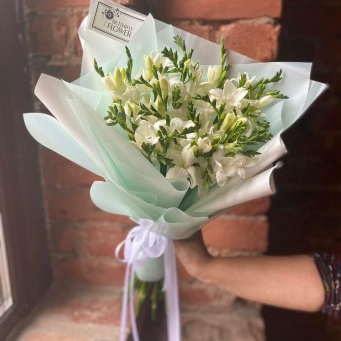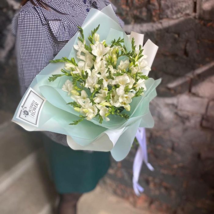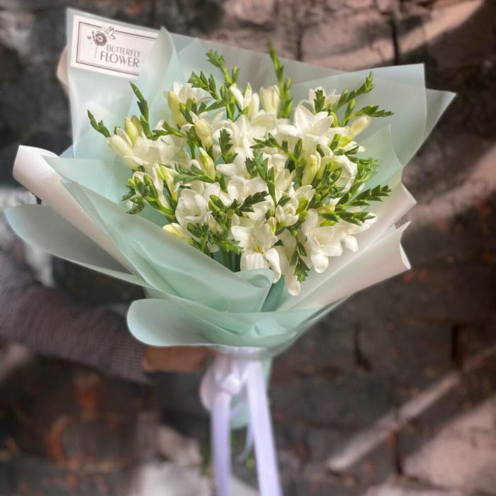 Букет из 27 белых фрезий в стильной упаковке “Перт”