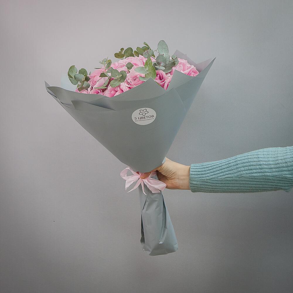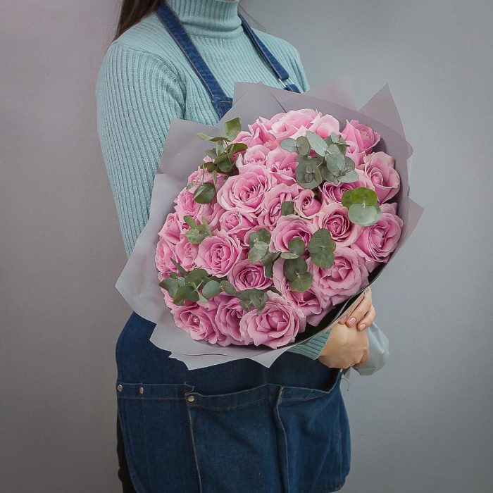 Эвкалипт – 1 шт.розы – 35 шт.дизайнерская упаковка и атласная лента – 1 шт.