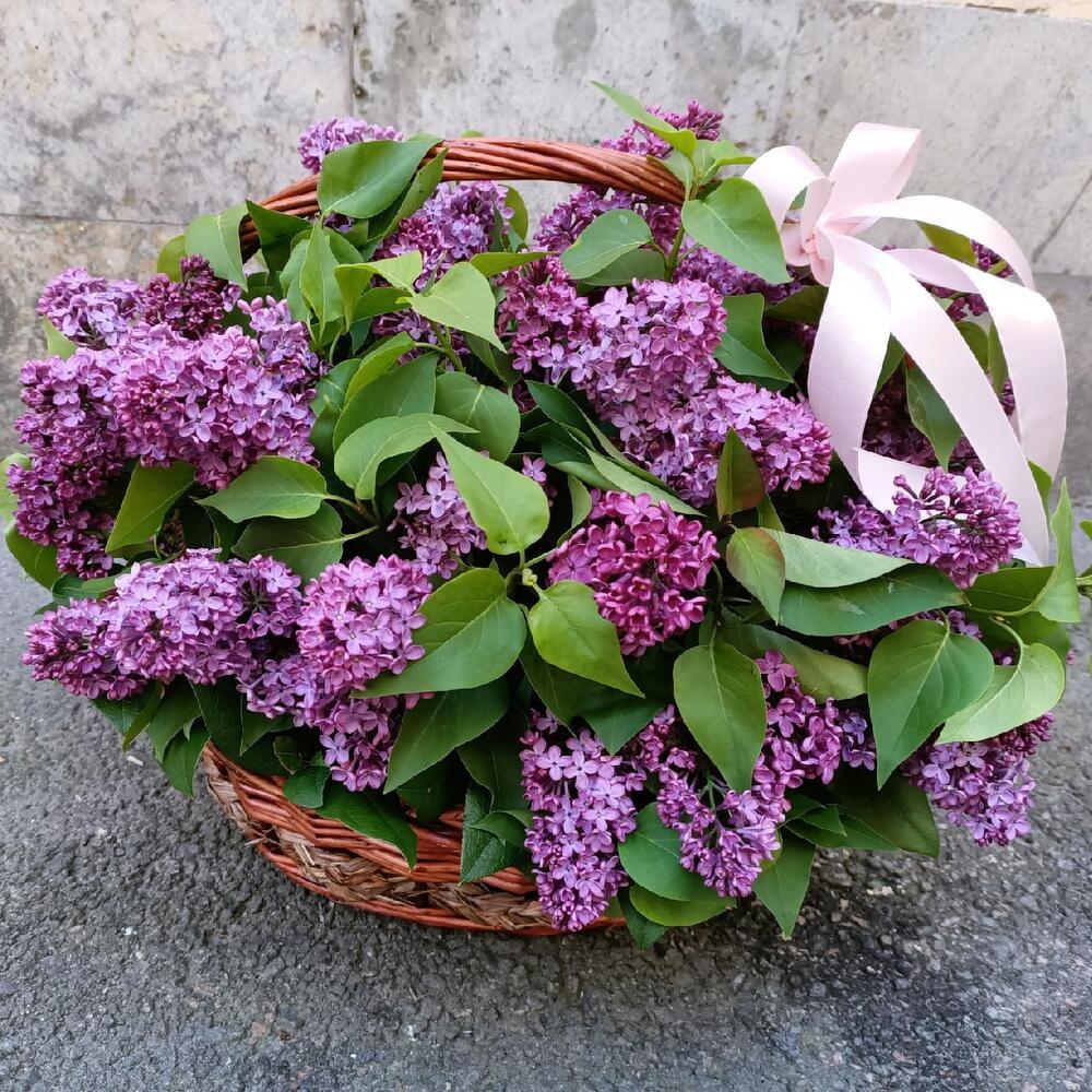 Сирень – 11 шт.Лента атласная – 1 шт.Корзина плетеная – 1 шт.Пленка матовая – 1 шт.Оазис флористический – 2 шт.
