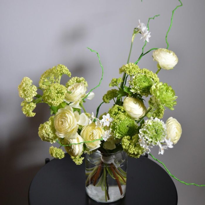 Ранункулюс – 10 шт.Вибурнум – 5 шт.Нарцисс – 5 шт.ветки декоративные – 3 шт.