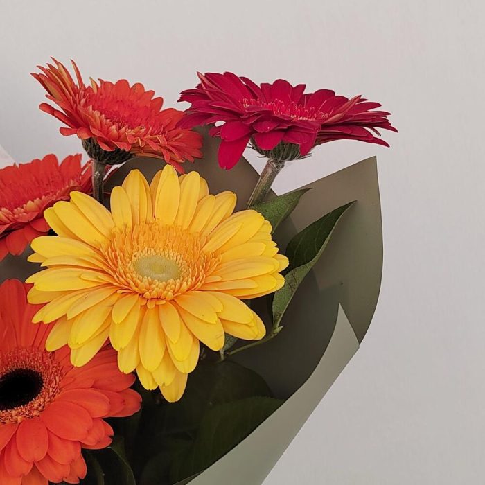 Зелень – 5 шт.Лента атласная – 1 шт.Гербера – 9 шт.Упаковка дизайнерская – 1 шт.