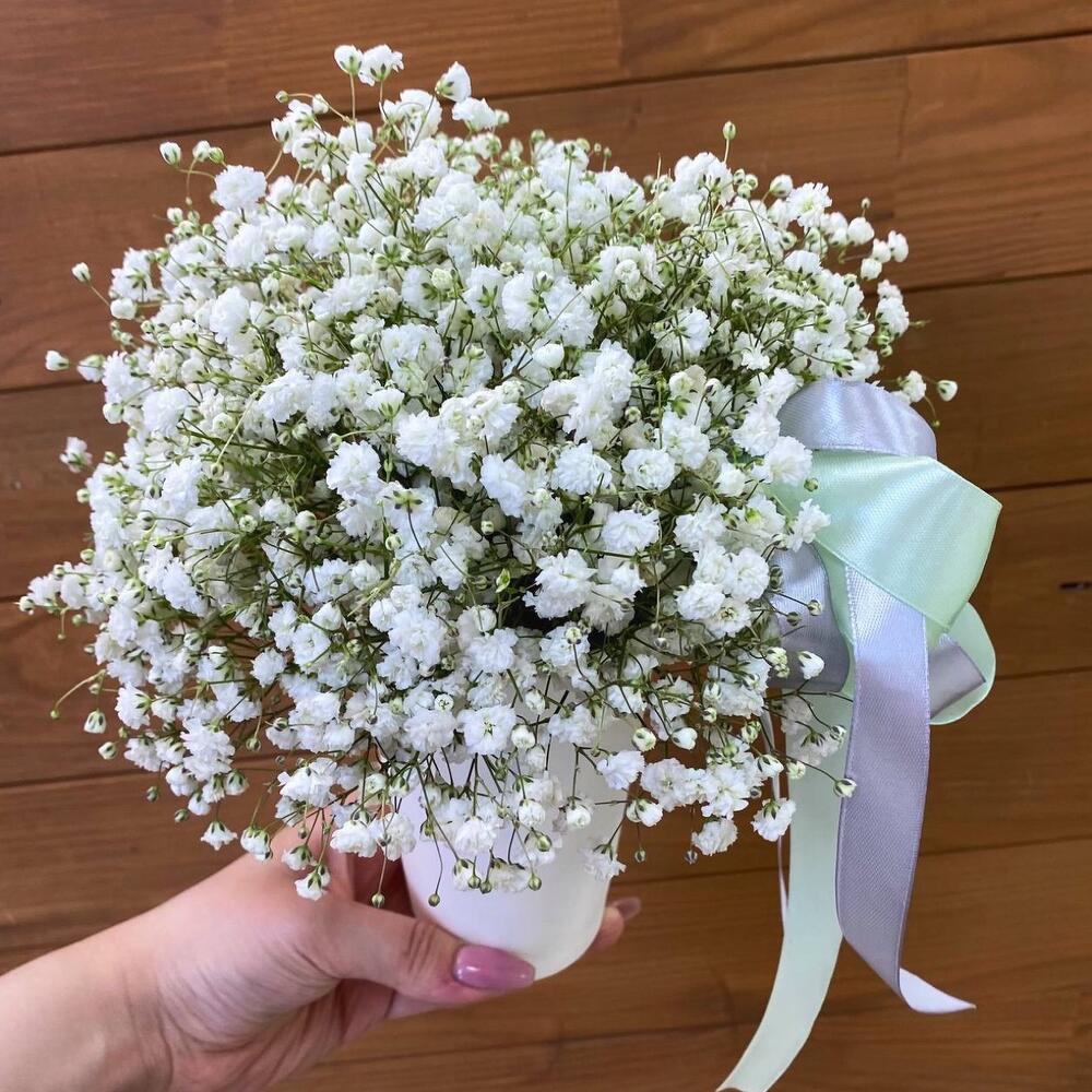 Гипсофила – 5 шт.Оазис флористический – 1 шт.Стакан – 1 шт.бант атласный – 2 шт.