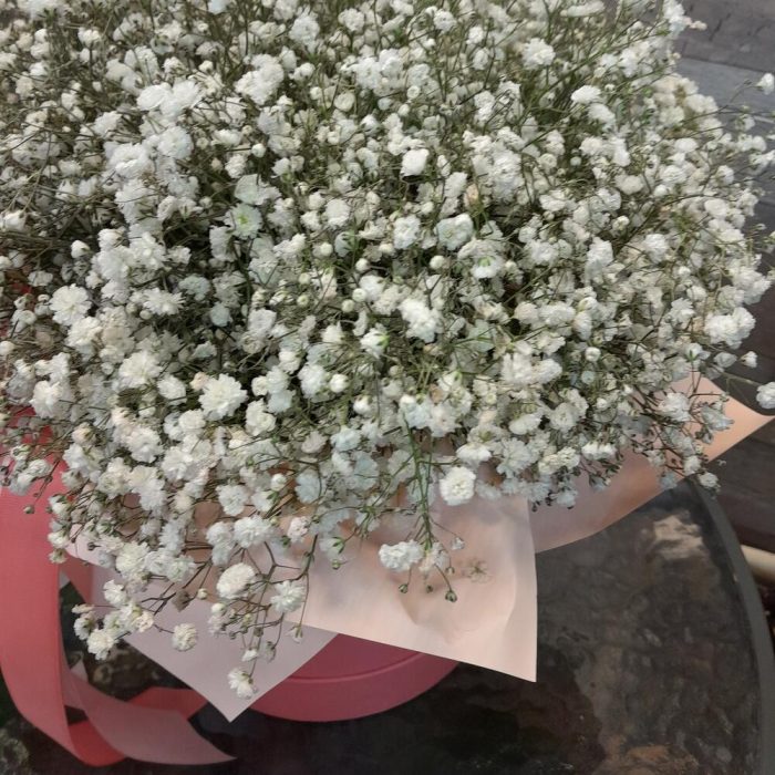 Гипсофила – 15 шт.Лента атласная – 4 шт.Шляпная коробка – 1 шт.Упаковка дизайнерская – 1 шт.Оазис флористический – 1 шт.