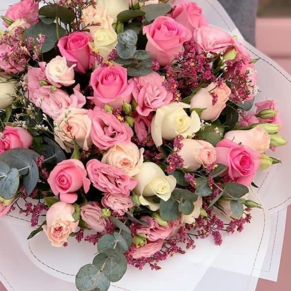 пионовидные розы – 14 шт.розы ассорти – 25 шт.Эвкалипт – 10 шт.Гипсофила – 10 шт.Упаковка дизайнерская – 1 шт.Лента атласная – 2 шт.Открытка – 1 шт.инструкция по уходу за цветами – 1 шт.хорошее настроение – 100 шт.коробка переноска – 1 шт.Кризал – 1 шт.