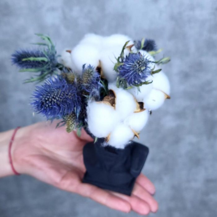 Хлопок – 5 шт.Эрингиум – 4 шт.Оазис флористический – 1 шт.голова из гипсофила – 1 шт.