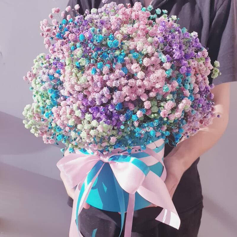 Лента атласная – 2 шт.Оазис флористический – 1 шт.гипсофила радужная – 11 шт.любовь флориста (бесплатно) – 1 шт.коробка шляпная большая изумрудная – 1 шт.