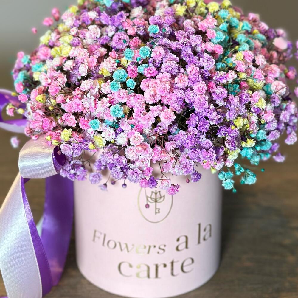 Лента атласная – 2 шт.Коробка шляпная – 1 шт.Оазис флористический – 1 шт.гипсофила радужная – 4 шт.
