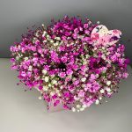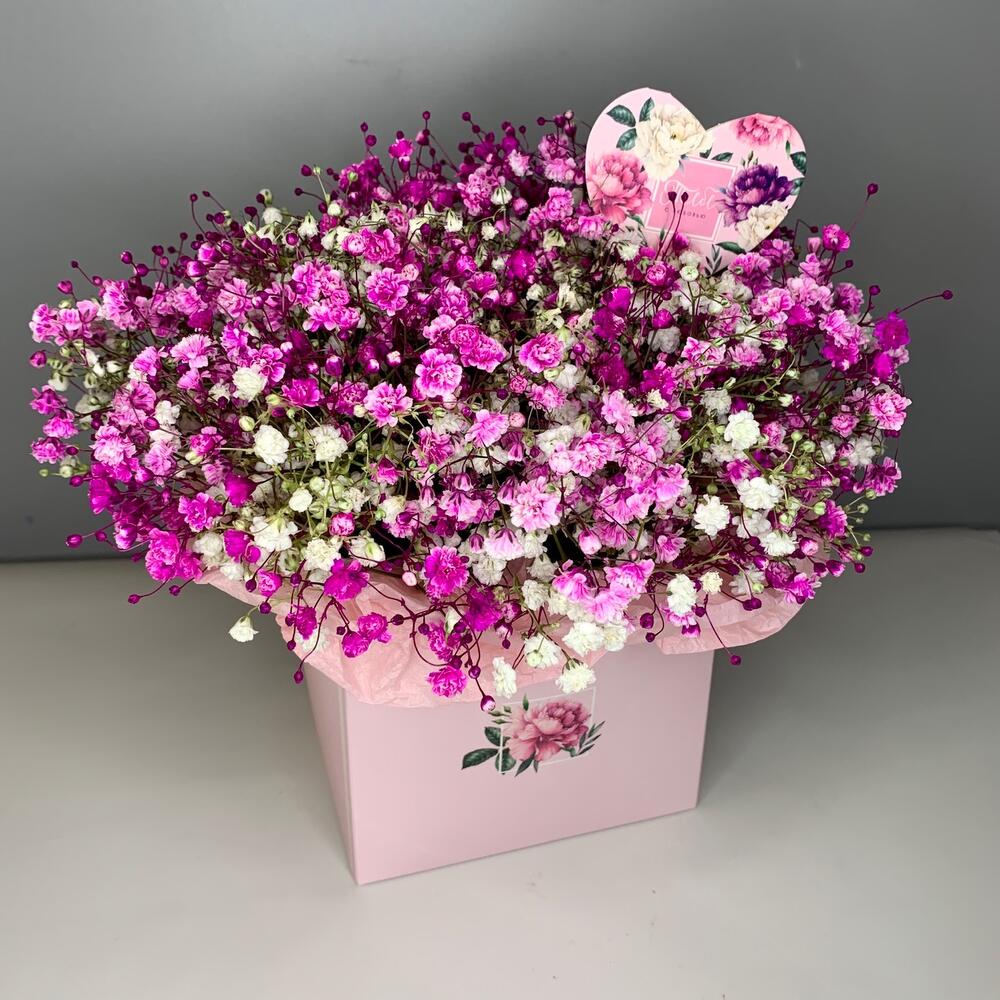 гипсофила цветная – 5 шт.Коробка – 1 шт.Тишью – 3 шт.Топпер – 1 шт.Пленка прозрачная – 1 шт.Лента атласная – 2 шт.