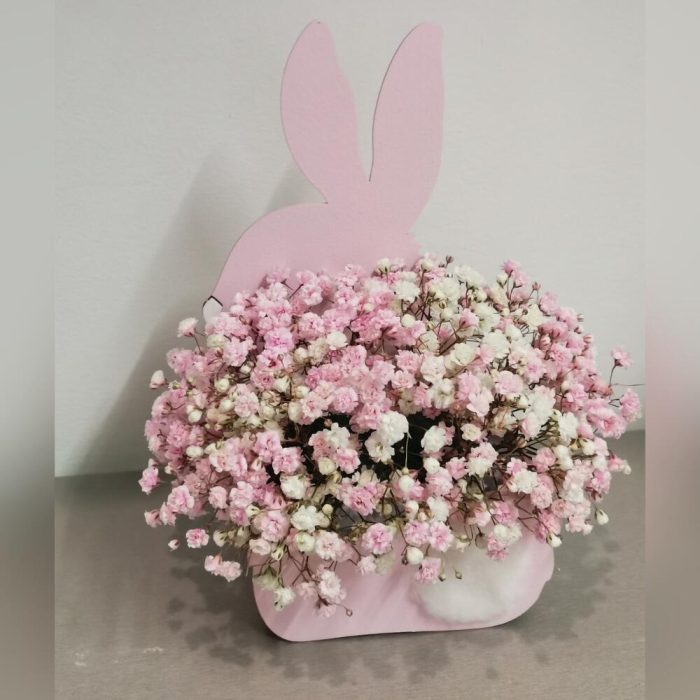 Оазис флористический – 1 шт.гипсофила розовая и белая – 4 шт.ящик “зайка розовый” – 1 шт.