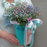 “Сиреневый туман” – композиция из гипсофилы в шляпной коробке