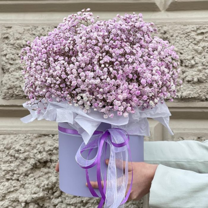 “Сиреневый туман” – композиция из гипсофилы в шляпной коробке