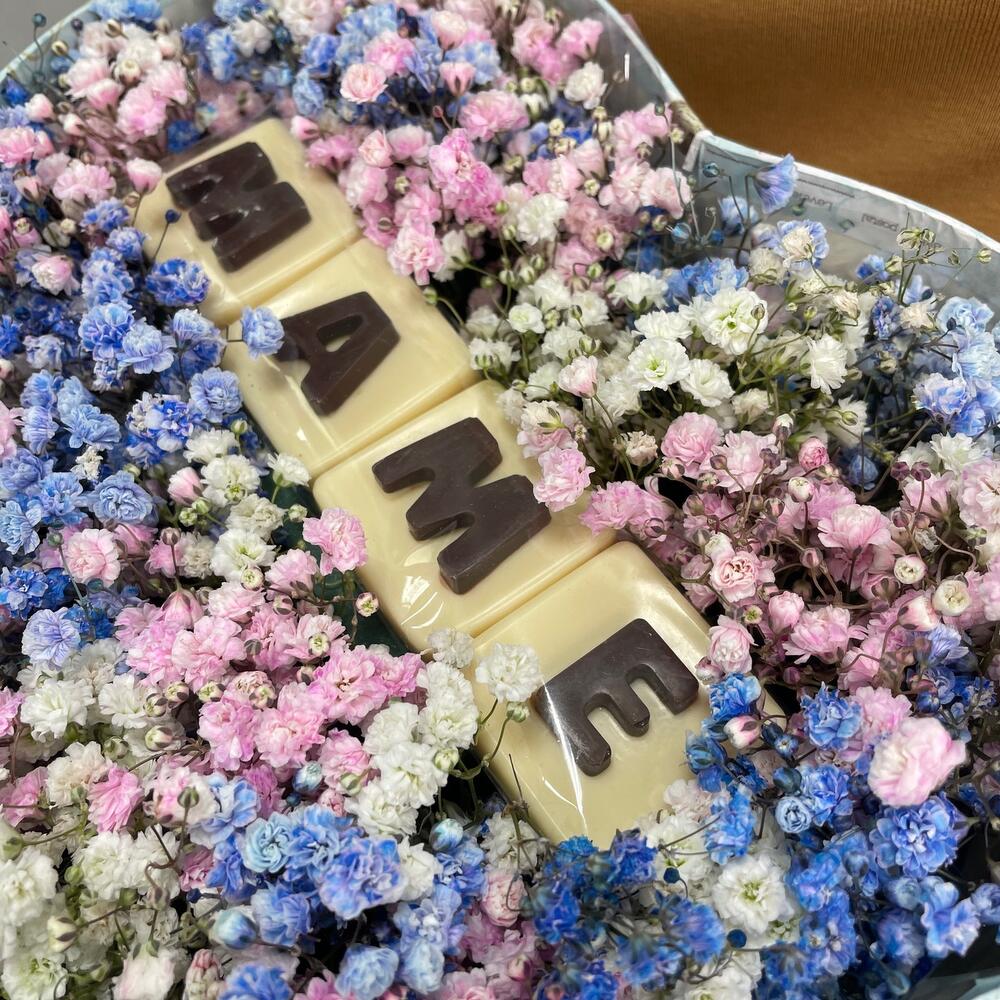 Коробка сердце – 1 шт.Оазис – 1 шт.Шоколадная буква – 4 шт.гипсофила цветная – 5 шт.