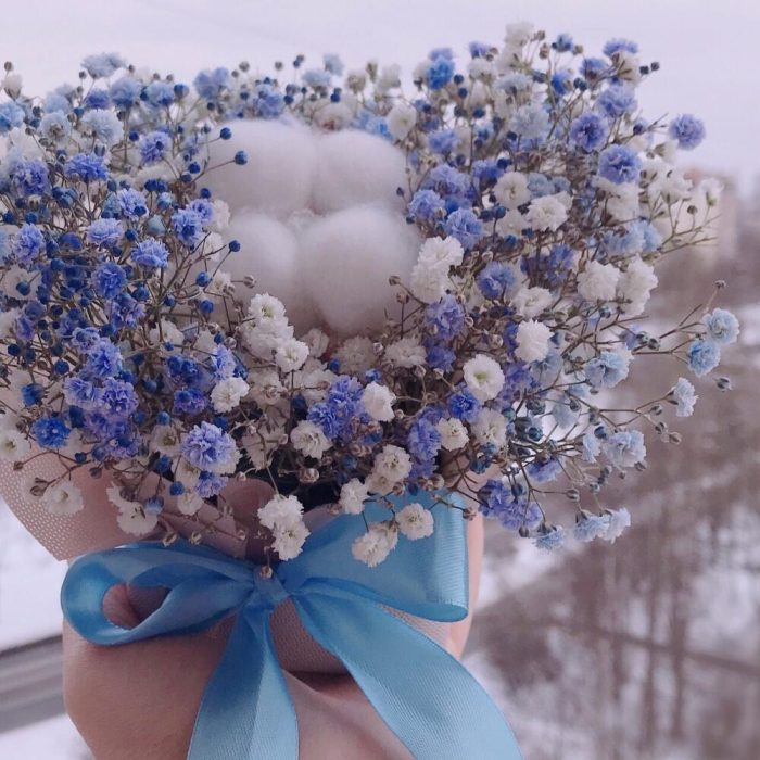 Хлопок – 1 шт.Флористическая губка – 1 шт.Гипсофила голубая – 1 шт.гипсофила белая – 1 шт.