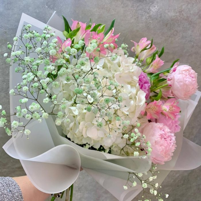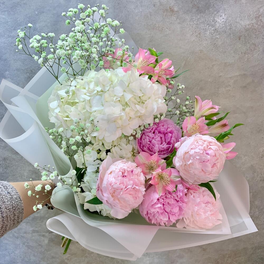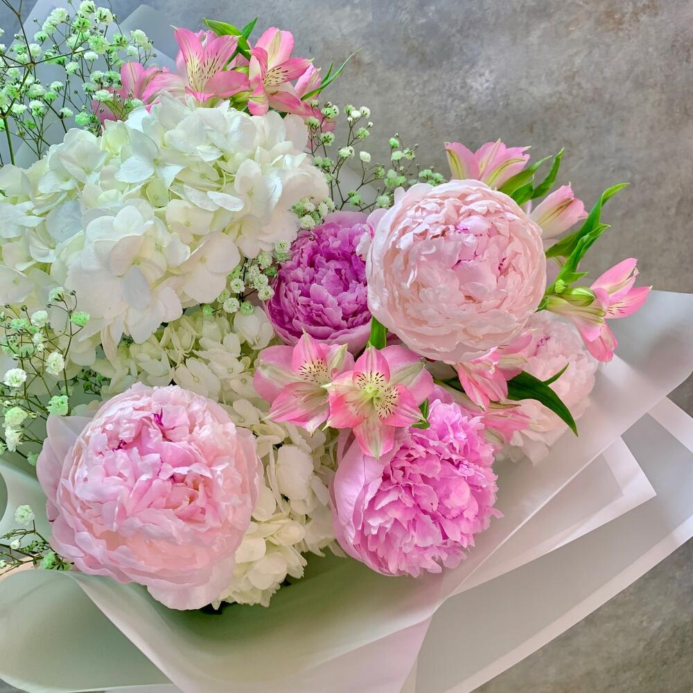 Пион Сара Бернар – 5 шт.Гортензия – 2 шт.Альстромерия – 3 шт.Гипсофила – 1 шт.Рускус – 3 шт.Упаковка дизайнерская – 2 шт.