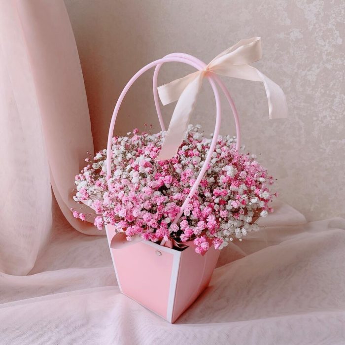 Лента атласная – 1 шт.Сумочка – 1 шт.Флористическая губка (оазис) – 1 шт.Гипсофила розовая – 3 шт.гипсофила белая – 2 шт.