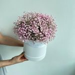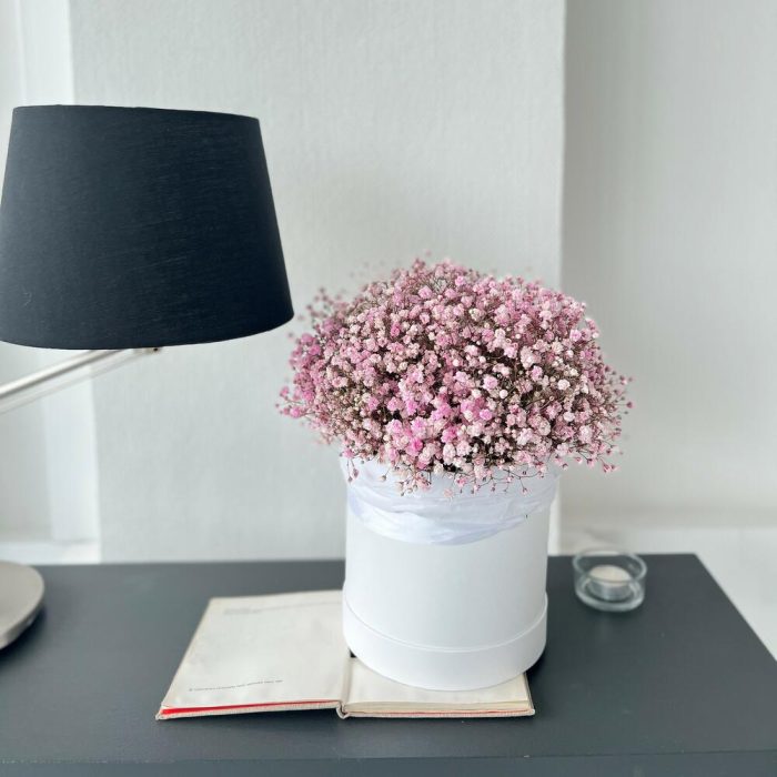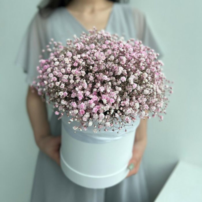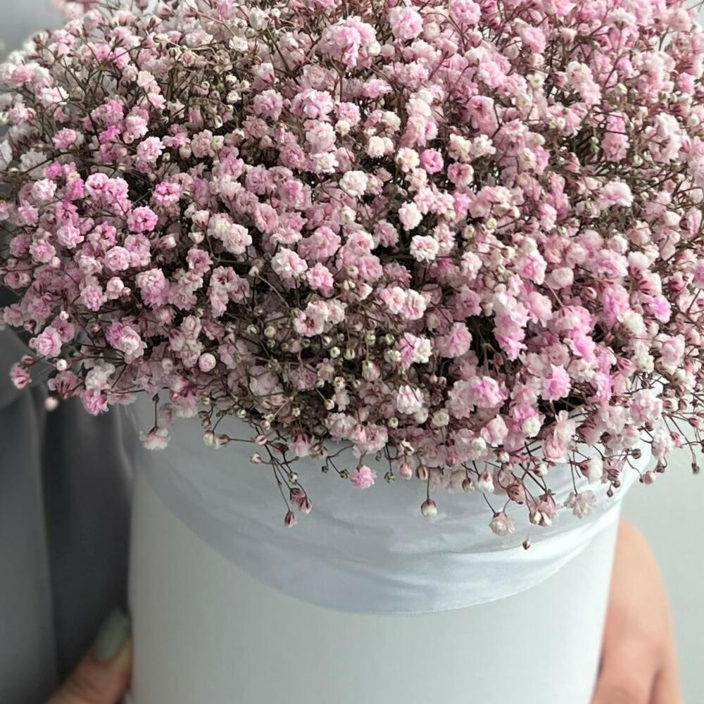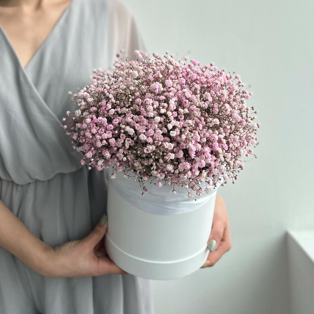 Композиция из 7 стеблей розовой гипсофилы в светлой шляпной коробке