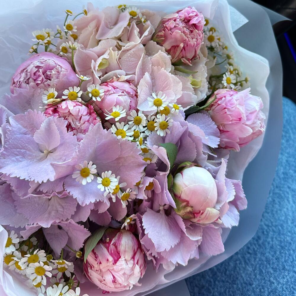 Гортензия – 3 шт.Пион – 7 шт.Лента атласная – 1 шт.Матрикария – 5 шт.Упаковка дизайнерская – 1 шт.Открыточка с вашими пожеланиями – 1 шт.