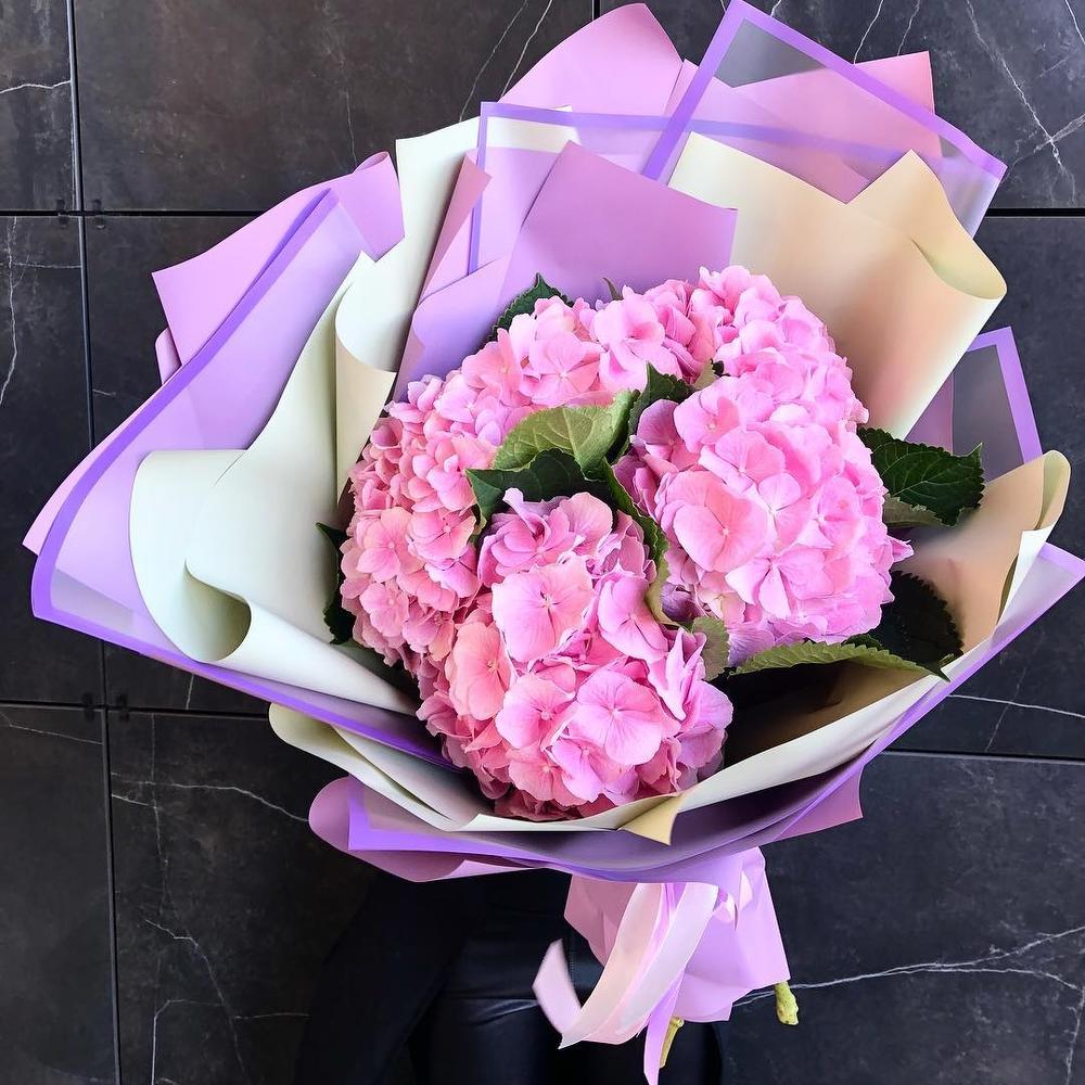 Букет из 5 розовых гортензий в стильной упаковке