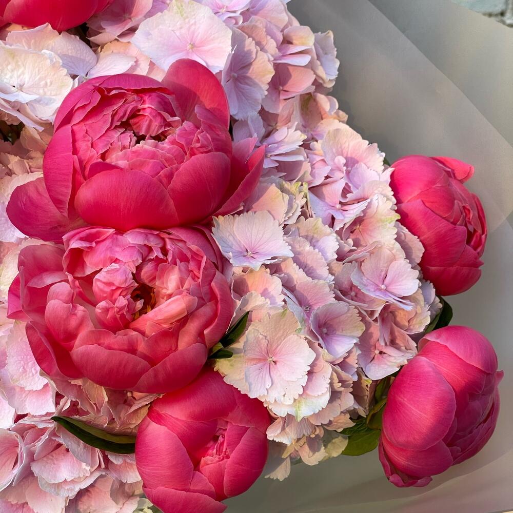 Гортензия – 5 шт.Пион Коралл Шарм (Coral Charm) – 7 шт.Лента атласная – 1 шт.Фисташка – 2 шт.Упаковка дизайнерская – 5 шт.лента силиконовая брендированная – 1 шт.