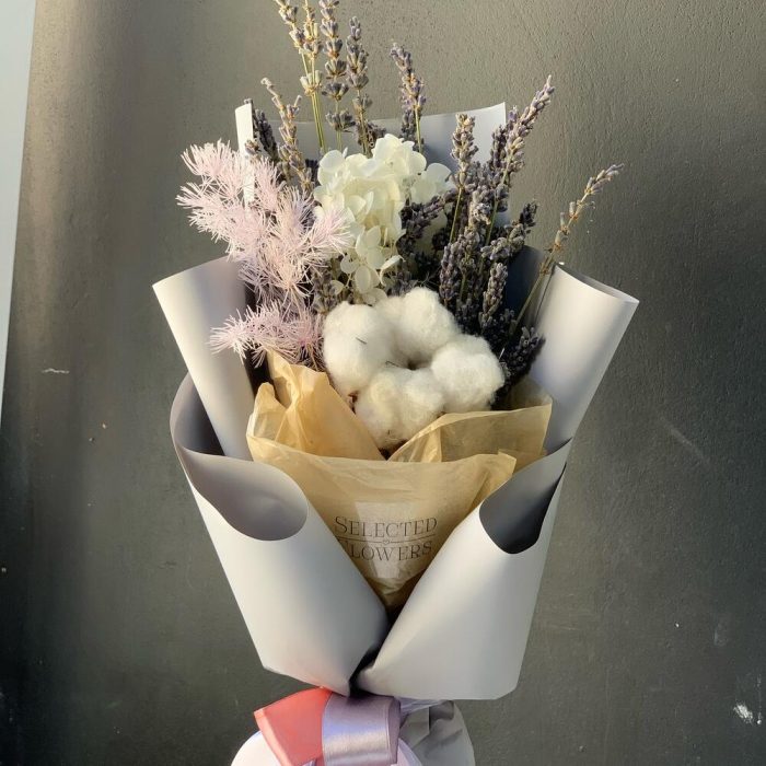 «Лавандовое созвездие» Букет из розы, гвоздики, статица и хлопка
