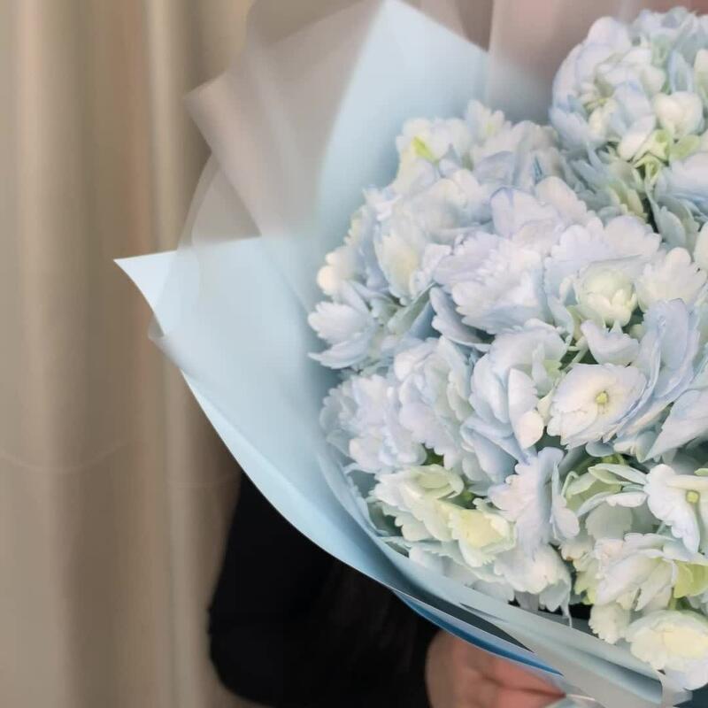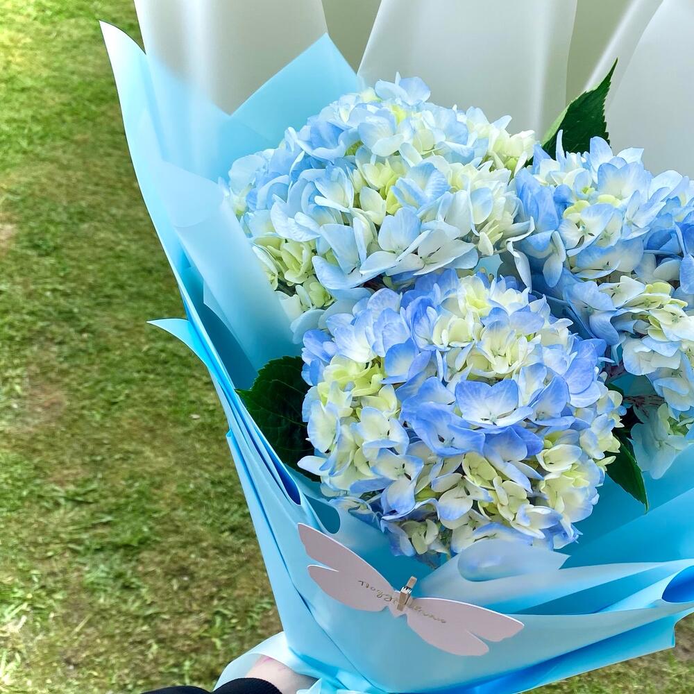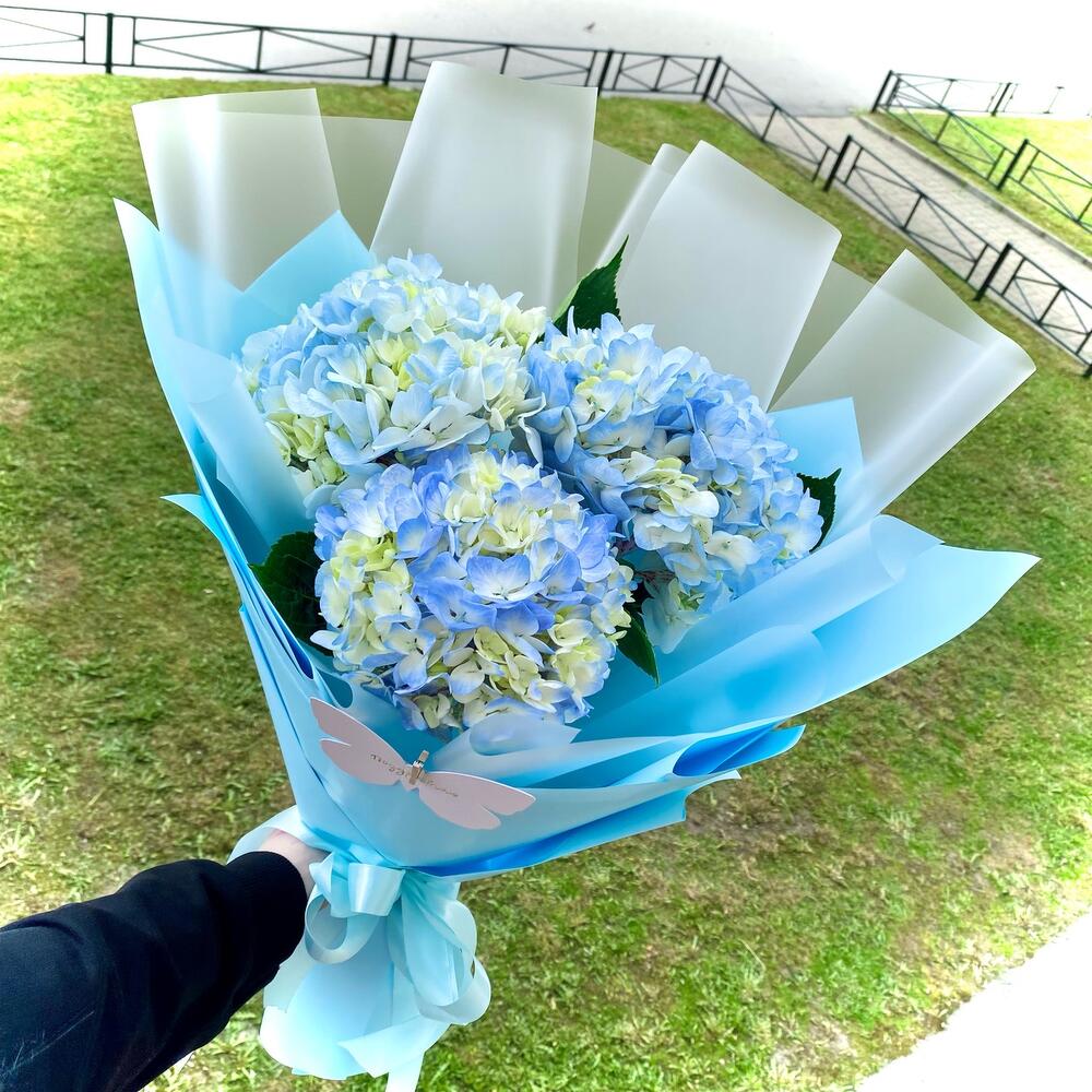 Гортензия – 3 шт.Лента атласная – 1 шт.Пленка матовая – 1 шт.Открыточка с вашими пожеланиями – 1 шт.