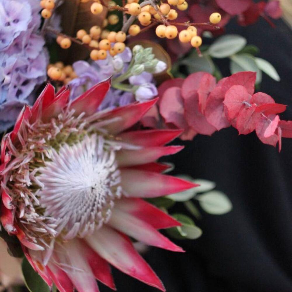 Протея – 1 шт.Гладиолус – 1 шт.илекс ветка – 2 шт.Гортензия – 1 шт.Маттиола – 3 шт.Котинус – 3 шт.листья магнолии ветка – 1 шт.эвкалипт стабилизируемый – 2 шт.Питтоспорум – 2 шт.Лента – 1 шт.