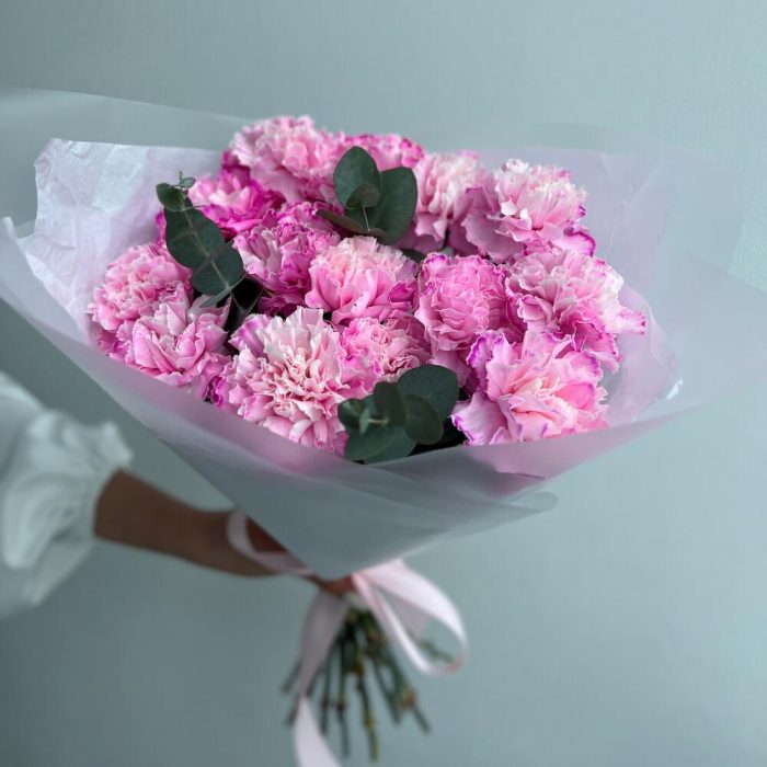 15 ярко-розовых гвоздик с эвкалиптом (букет N 45)