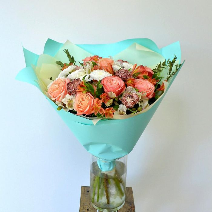 Альстромерия – 9 шт.Хризантема кустовая – 3 шт.Зелень – 1 шт.Диантус – 5 шт.Оригинальная упаковка – 1 шт.пионовидные розы – 7 шт.