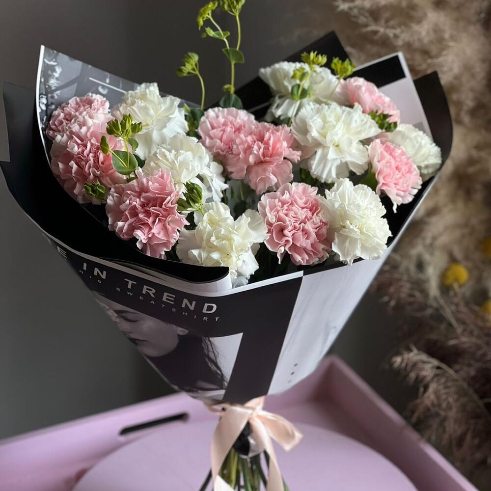 Гвоздика сортовая – 15 шт.Буплерум – 2 шт.Авторская упаковка – 1 шт.памятка по уходу – 1 шт.крафт конверт – 1 шт.