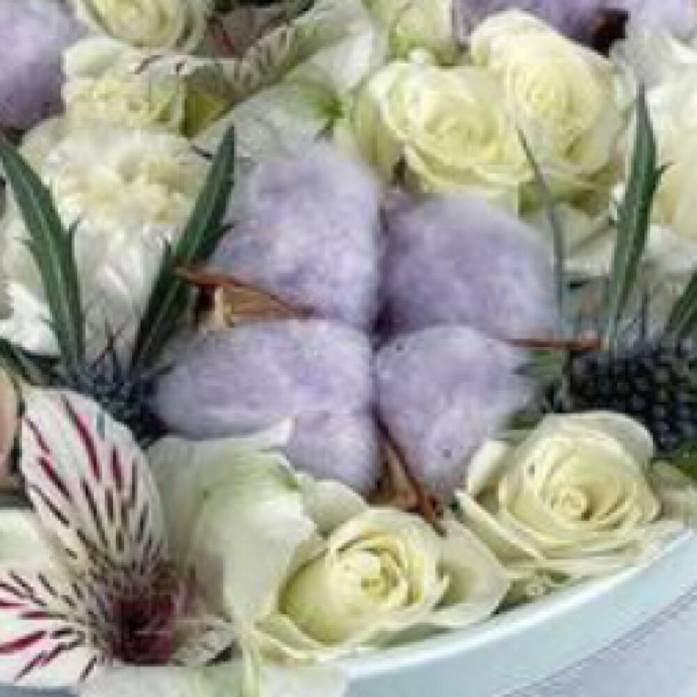 Альстромерия – 1 шт.Хлопок – 3 шт.Роза – 3 шт.Кустовая роза – 2 шт.Гвоздика – 4 шт.Оазис – 1 шт.Бант – 3 шт.Коробка – 1 шт.