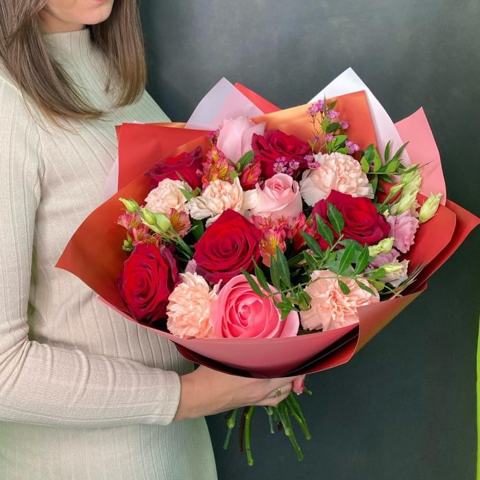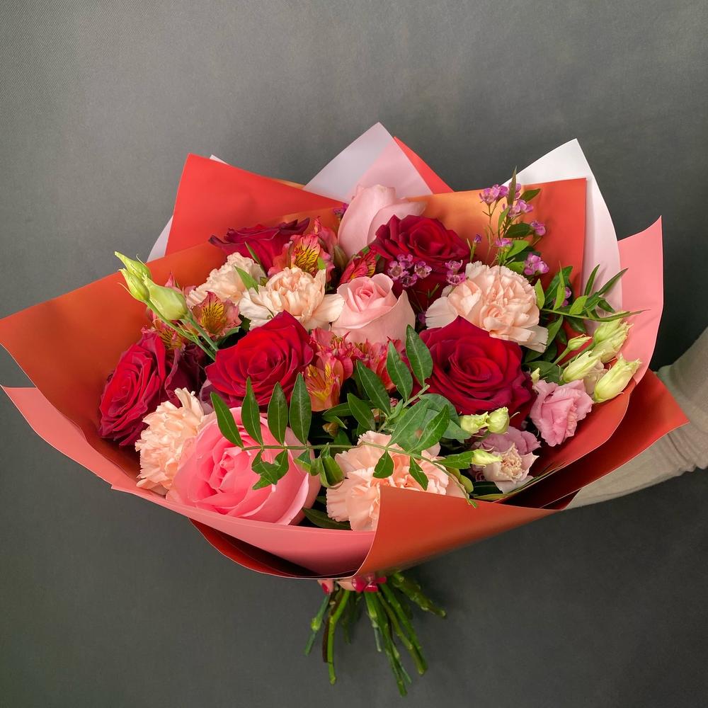 Роза Эквадор – 7 шт.Диантус – 5 шт.Лизиантус – 1 шт.Альстромерия Микс Европа – 3 шт.Упаковка дизайнерская – 3 шт.Лента атласная – 1 шт.Ваксфлауэр – 1 шт.