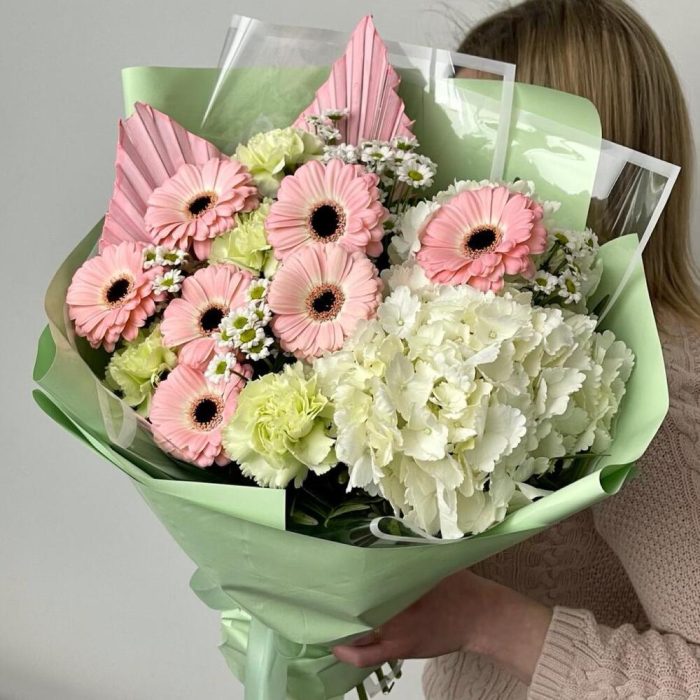 Гермини – 7 шт.Гортензия – 1 шт.Диантус – 4 шт.Сантини – 5 шт.Листья пальмы – 2 шт.Упаковка дизайнерская – 4 шт.Фисташка – 5 шт.