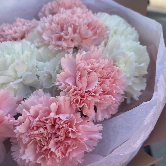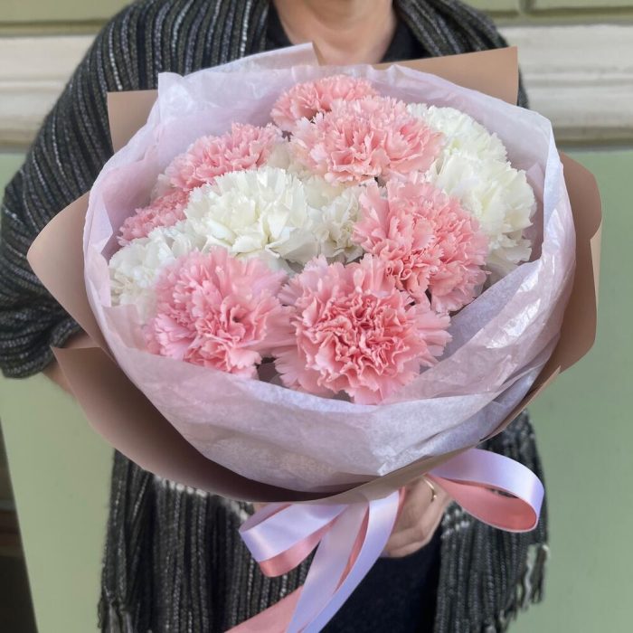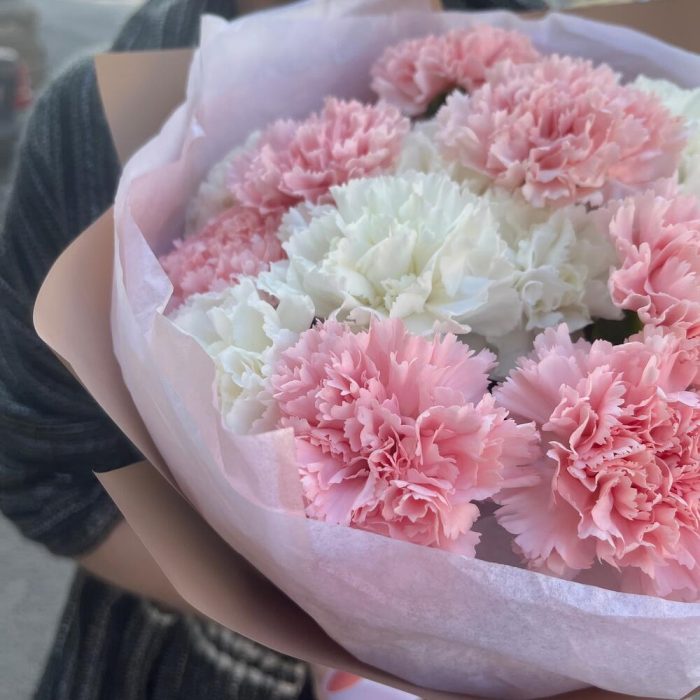 Лента атласная – 2 шт.Тишью – 1 шт.Диантус белый – 7 шт.Упаковка корейская пленка – 1 шт.диантус нежно-розовый – 10 шт.