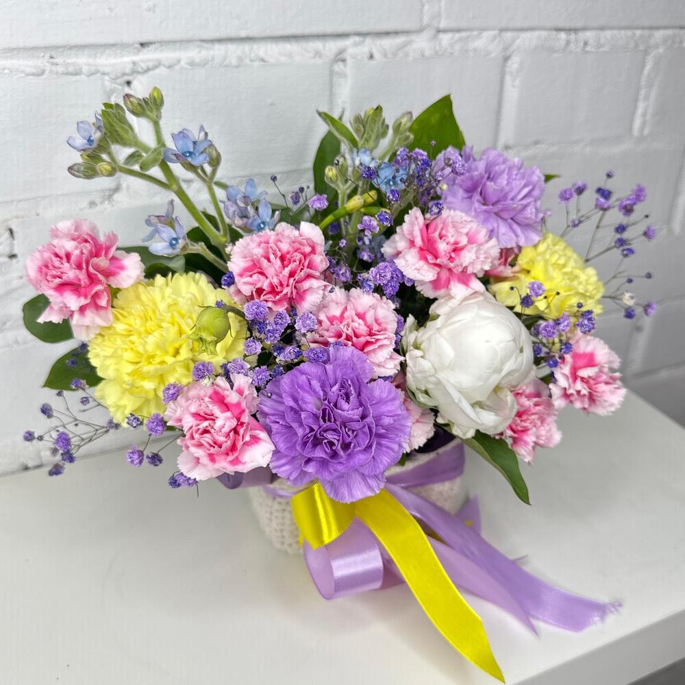 Диантус кустовой – 7 шт.Диантус – 4 шт.Оксипеталум – 2 шт.Гипсофила – 3 шт.Фисташка – 3 шт.Оазис флористический – 1 шт.Плетеное кашпо – 1 шт.
