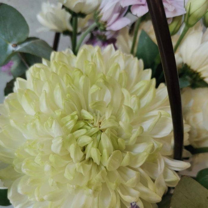 Хризантема – 1 шт.Хризантема кустовая – 1 шт.Сантини – 1 шт.Диантус – 3 шт.Эвкалипт – 3 шт.Оазис флористический – 1 шт.Сумка – 1 шт.