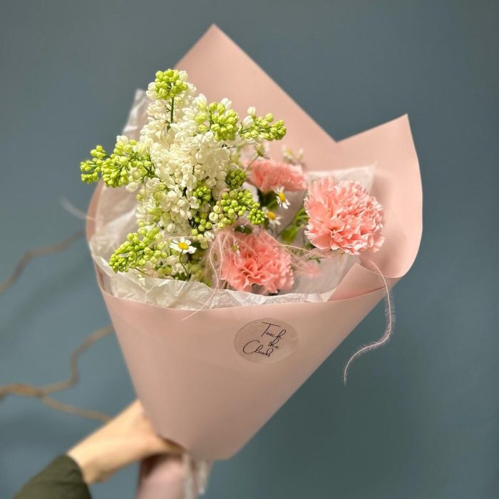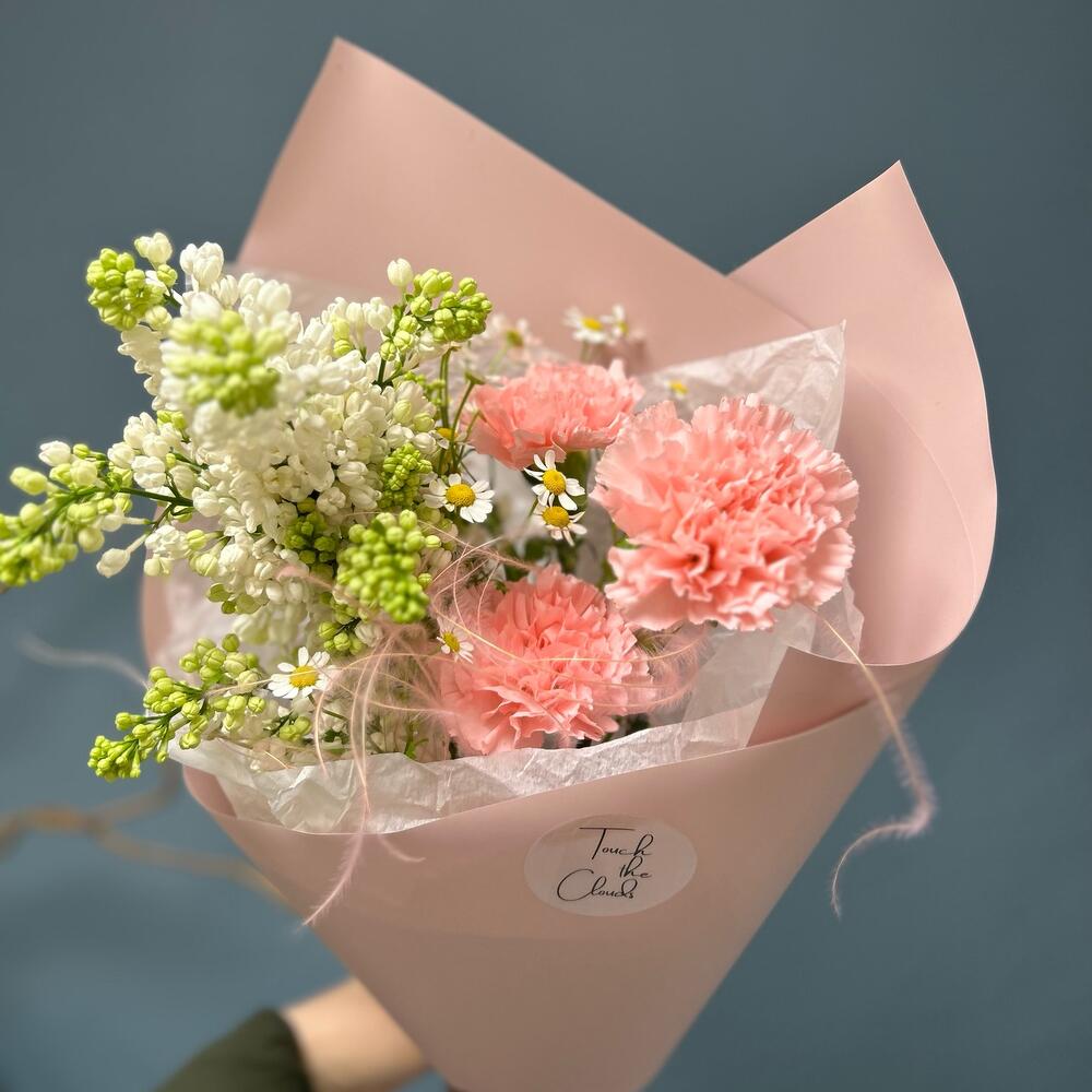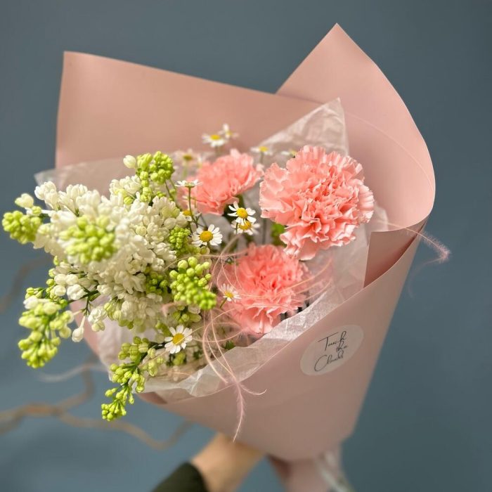 Нежный букет комплимент с гвоздикой, сиренью и матрикарией