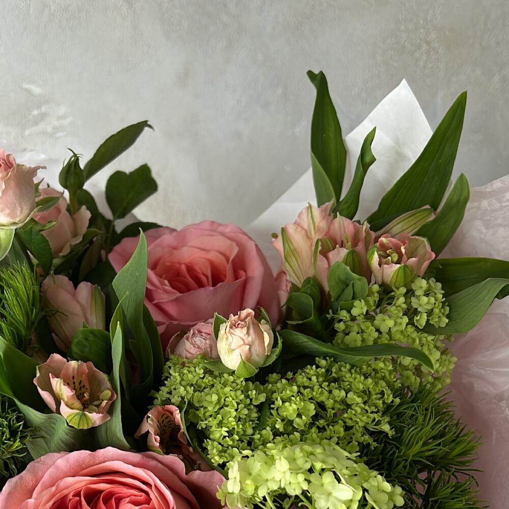 Альстромерия – 2 шт.Кустовая роза – 2 шт.Диантус – 2 шт.Роза пионовидная – 3 шт.Упаковка дизайнерская – 1 шт.грин трикс – 3 шт.