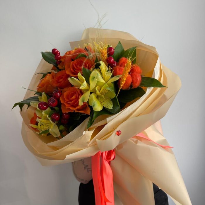 Роза Россия – 7 шт.Альстромерия – 3 шт.Диантус – 1 шт.Хлопок – 3 шт.Ягоды декоративные – 3 шт.Пшеница (сухоцвет) – 3 шт.Стифа – 1 шт.Рускус – 5 шт.Пленка матовая – 6 шт.Лента атласная – 2 шт.