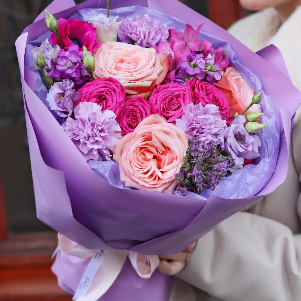 Кустовая пионовидная роза – 2 шт.kahala роза пионовидная – 3 шт.Гвоздика – 3 шт.Лизиантус – 1 шт.Маттиола – 2 шт.Анемон – 1 шт.Альстромерия – 1 шт.Упаковка дизайнерская – 1 шт.Открыточка с вашими пожеланиями – 1 шт.Шоколадка – 1 шт.