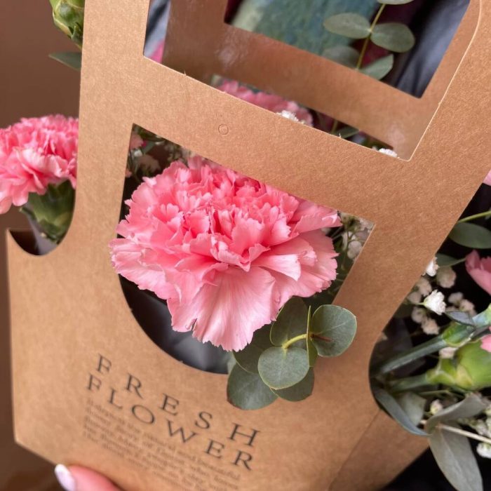 Цвет гвоздик может отличаться от фотоРекомендации по уходу:- цветы находятся во флористической губке, которую необходимо поливать 1 раз в 2-3 дня;- тонкой струёй воды в центре композиции, не попадая на цветы;- держать вдали от отопительных приборов и кондиционеров.