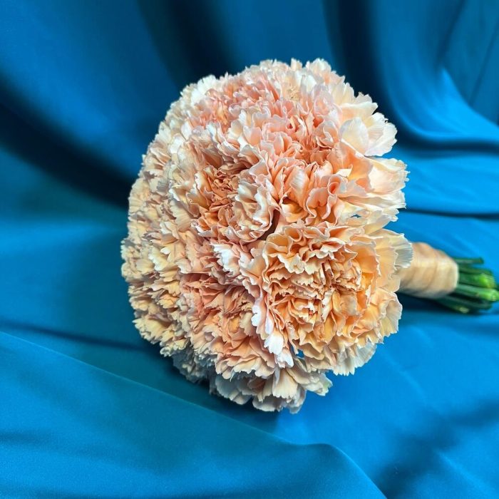 Свадебный букет имеет классическую круглую форму, выполнен в европейском стиле, что подразумевает минимализм. Диантус благодаря своим рюшечным лепесткам и оттенком придаёт букету особый шарм.