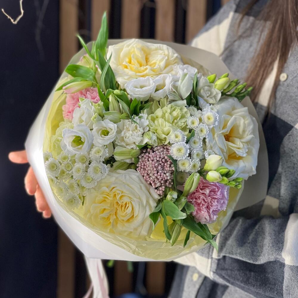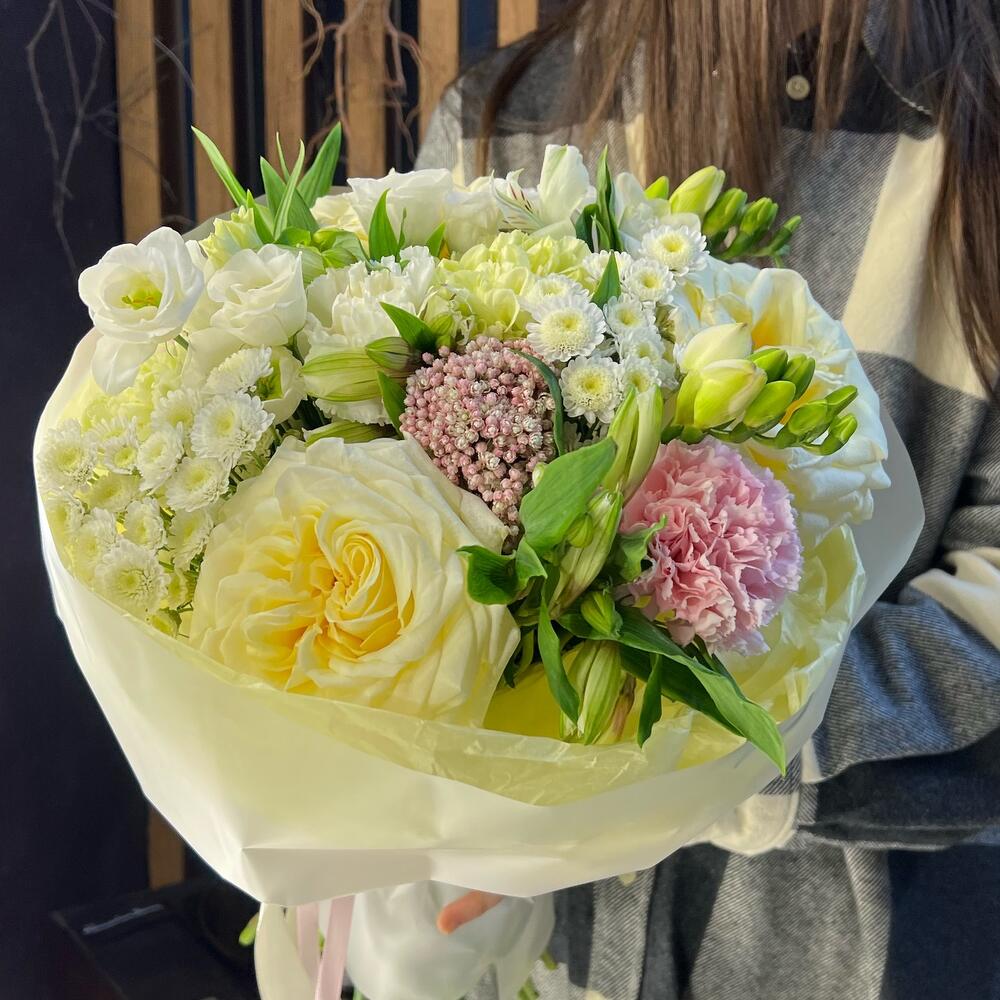 канделайт – 3 шт.Альстромерия белая – 5 шт.Диантус розовый – 7 шт.Озотамнус розовый – 1 шт.Сталион белый – 2 шт.Фрезия белая – 2 шт.лизиантус эустома белый – 2 шт.Фисташка пучок – 2 шт.Упаковка дизайнерская – 2 шт.Лента атласная – 2 шт.