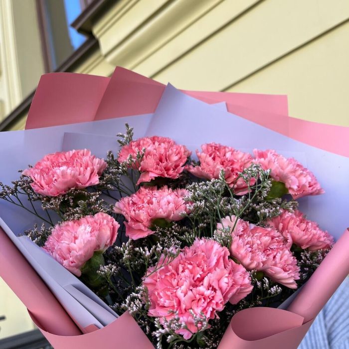 Лимониум – 2 шт.Лента атласная – 2 шт.Диантус розовый – 9 шт.Упаковка корейская пленка – 1 шт.