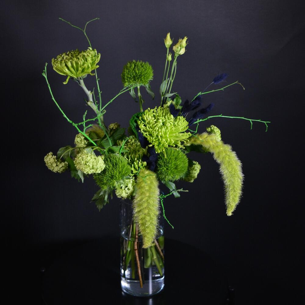 Хризантема – 4 шт.Гвоздика – 4 шт.Вибурнум – 2 шт.Сетария – 3 шт.ветки декоративные – 2 шт.Лагурус – 7 шт.Лотос – 1 шт.